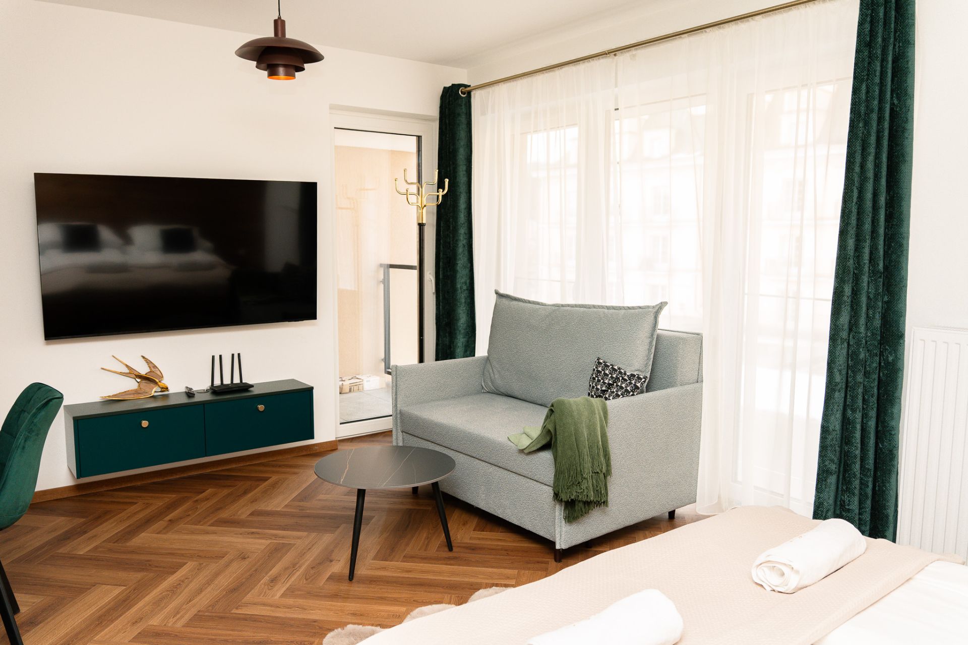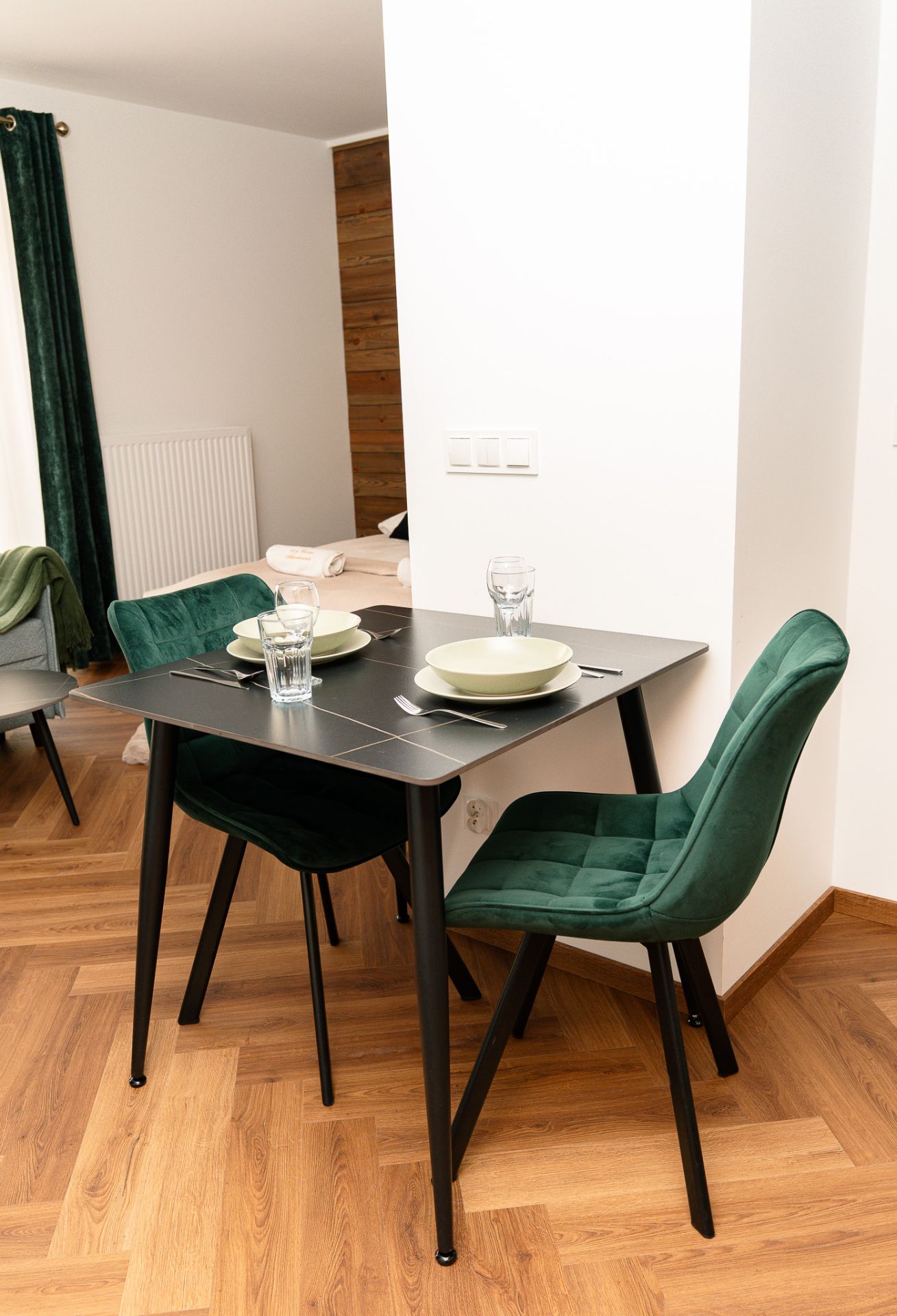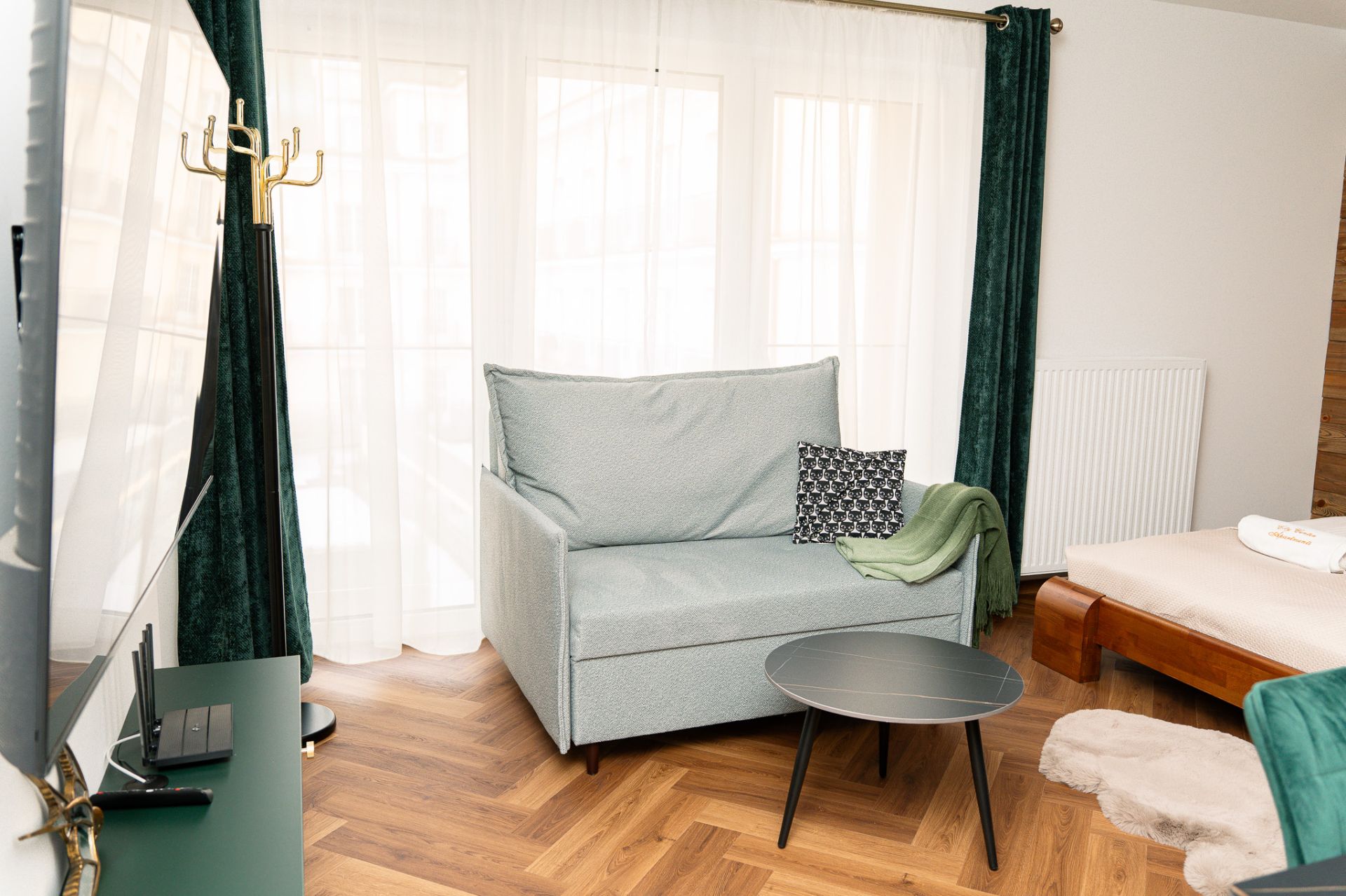 Może w nim spać nawet trzy osoby. Składa się z pokoju, aneksu kuchennego oraz łazienki. Urządzony jest funkcjonalnie i z ogromną dbałością o szczegóły, w stylu hotelowym.