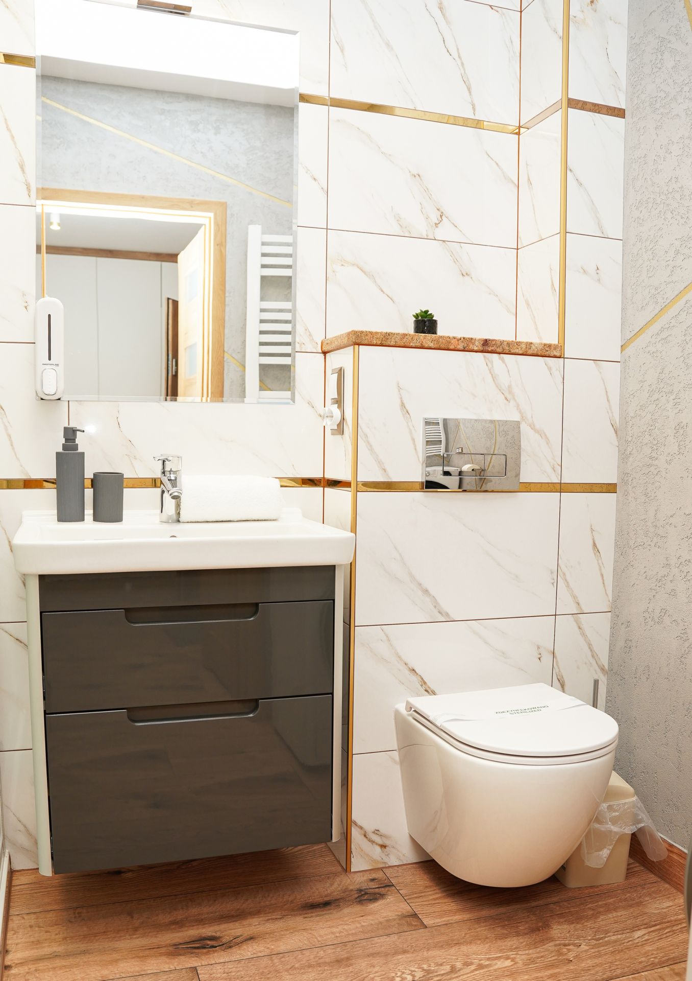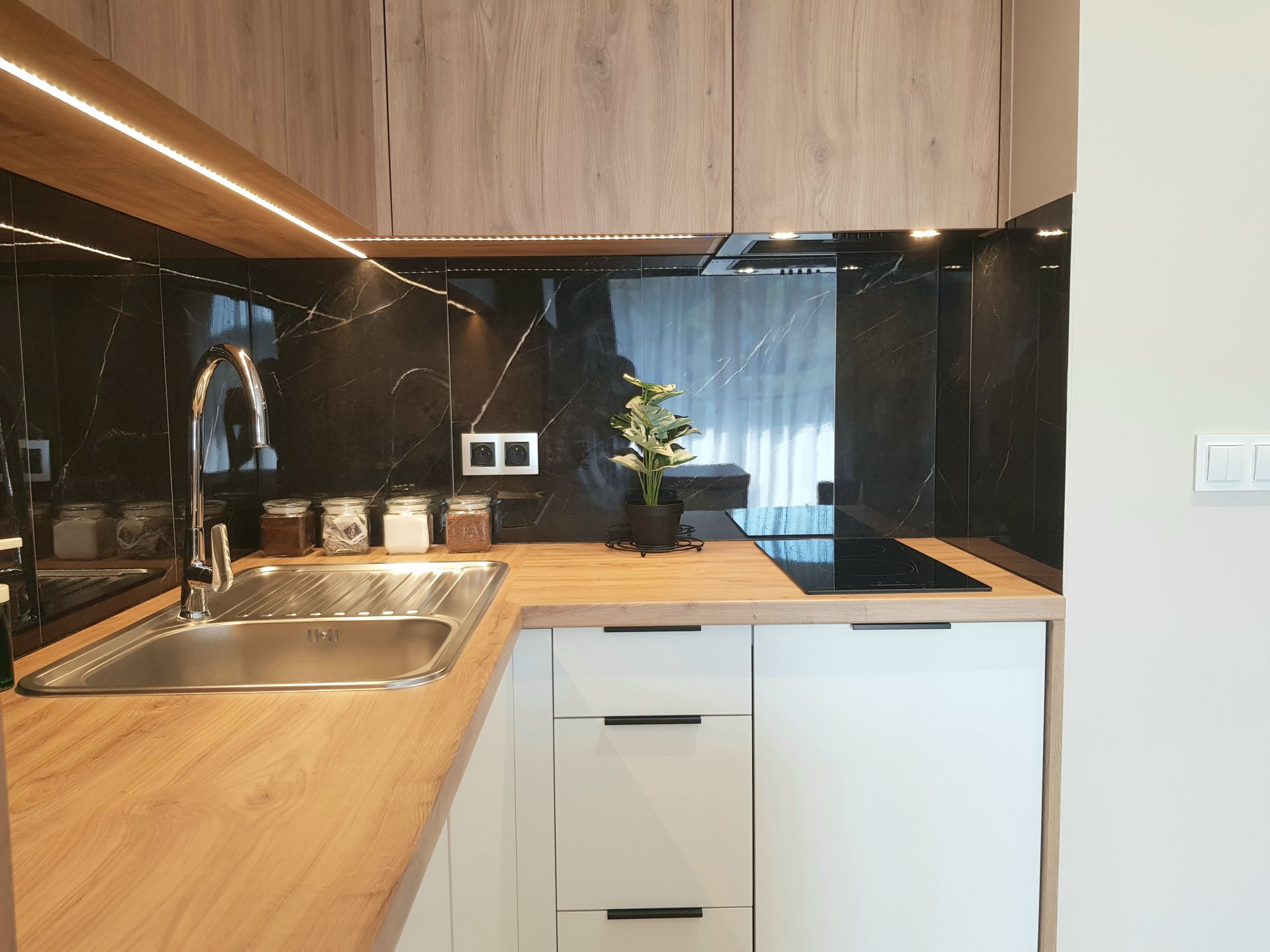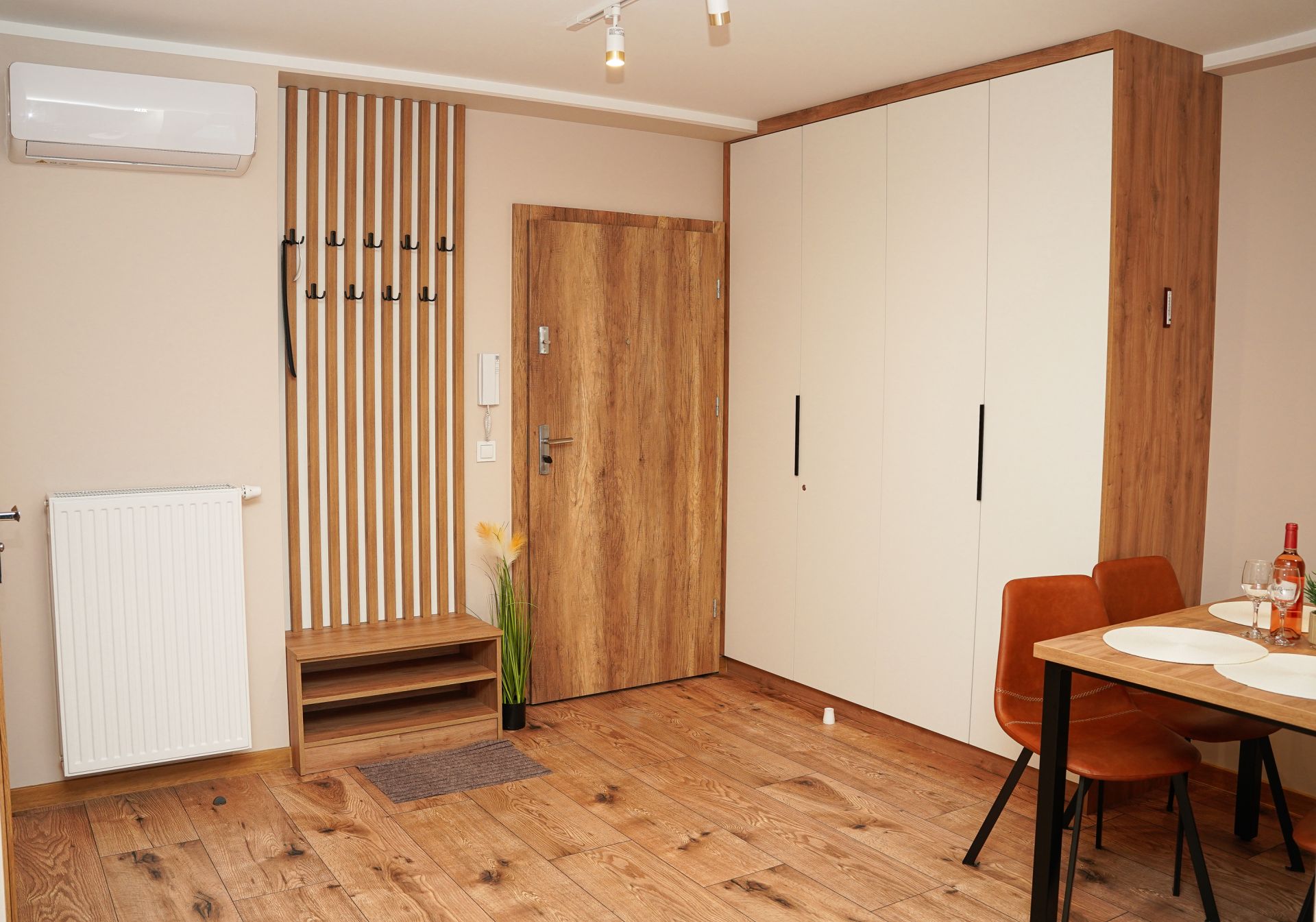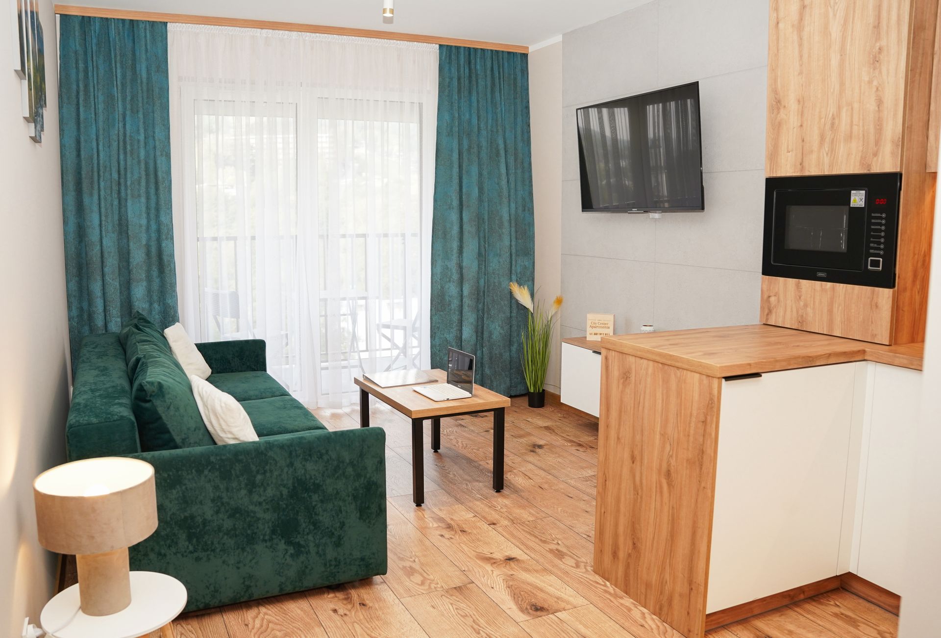 Aneks kuchenny został wyposażony we wszystko, co potrzeba, by samodzielnie przygotować posiłek: płyta indukcyjna, kuchenka mikrofalowa, lodówka, czajnik elektryczny, zastawa stołowa, garnki i przybory kuchenne. W łazience jest bardzo duża kabina prysznicowa oraz pralkosuszarka.