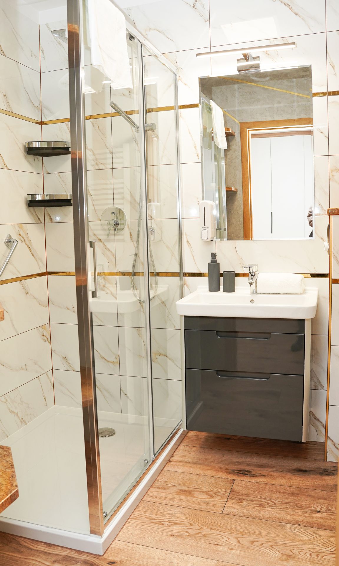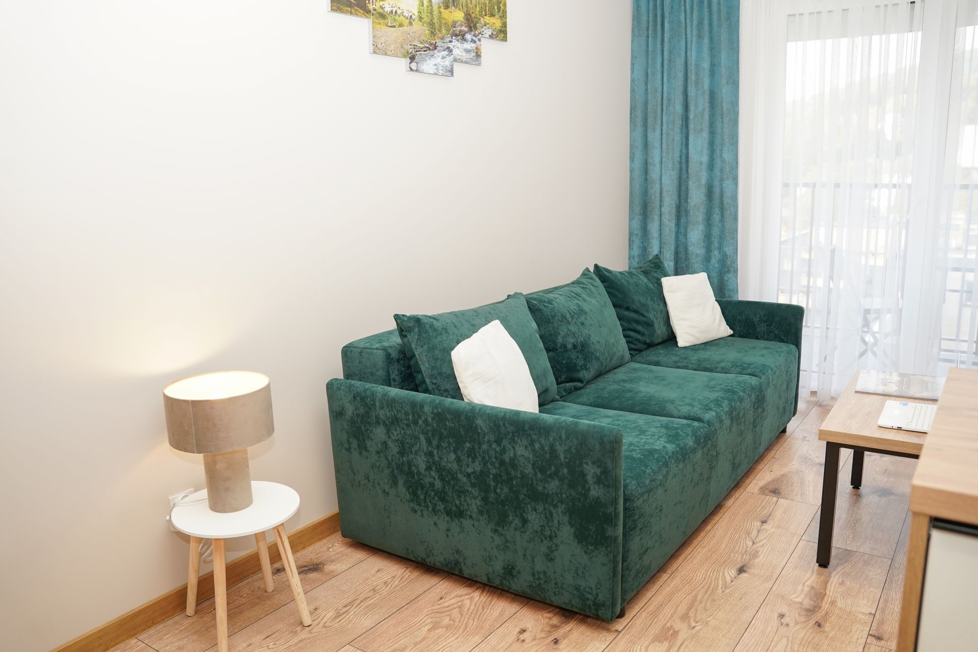 Przygotowany dla czterech osób. Składa się z sypialni, salonu, aneksu kuchennego oraz łazienki. Urządzony jest funkcjonalnie i z ogromną dbałością o szczegóły.