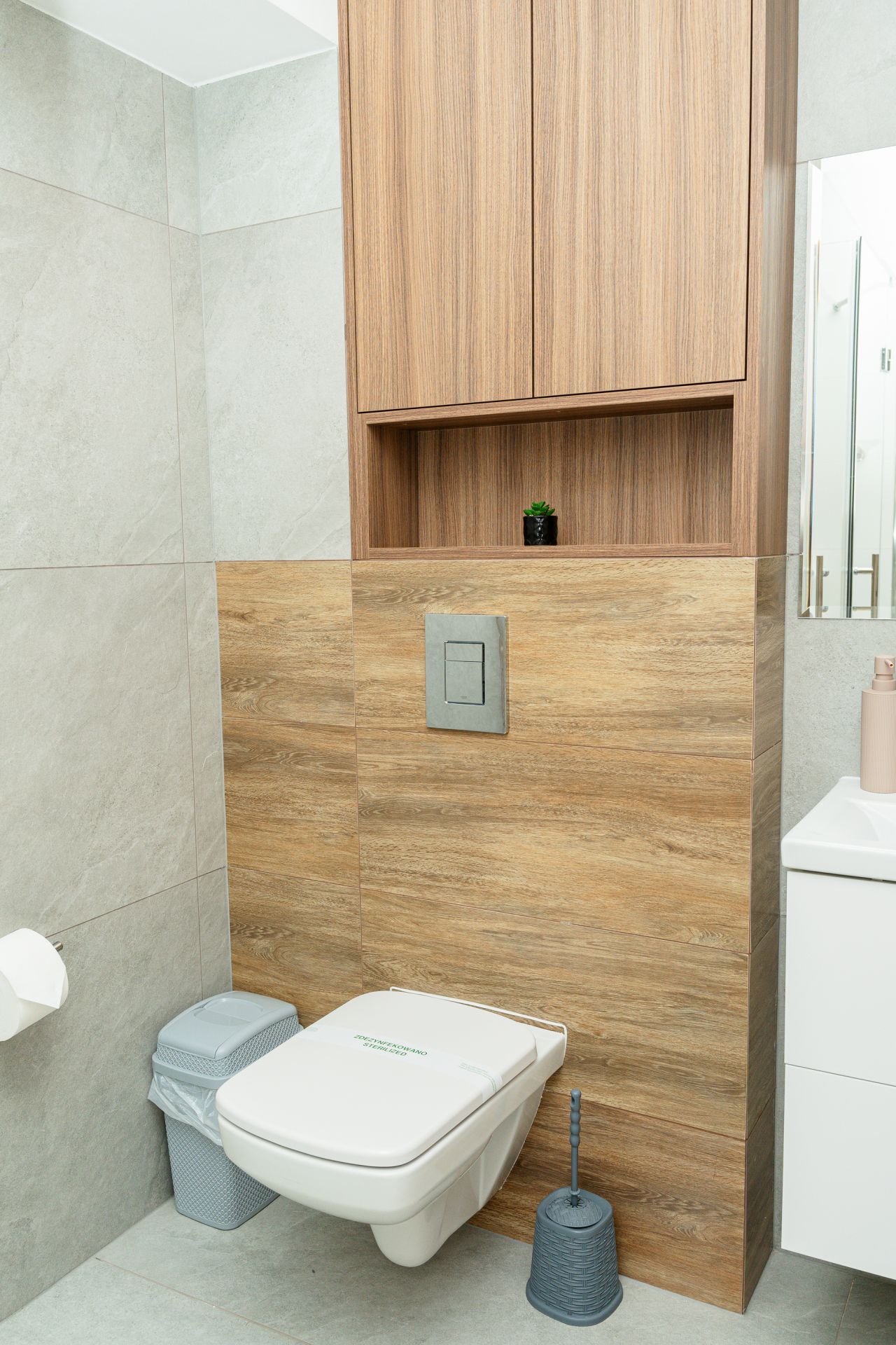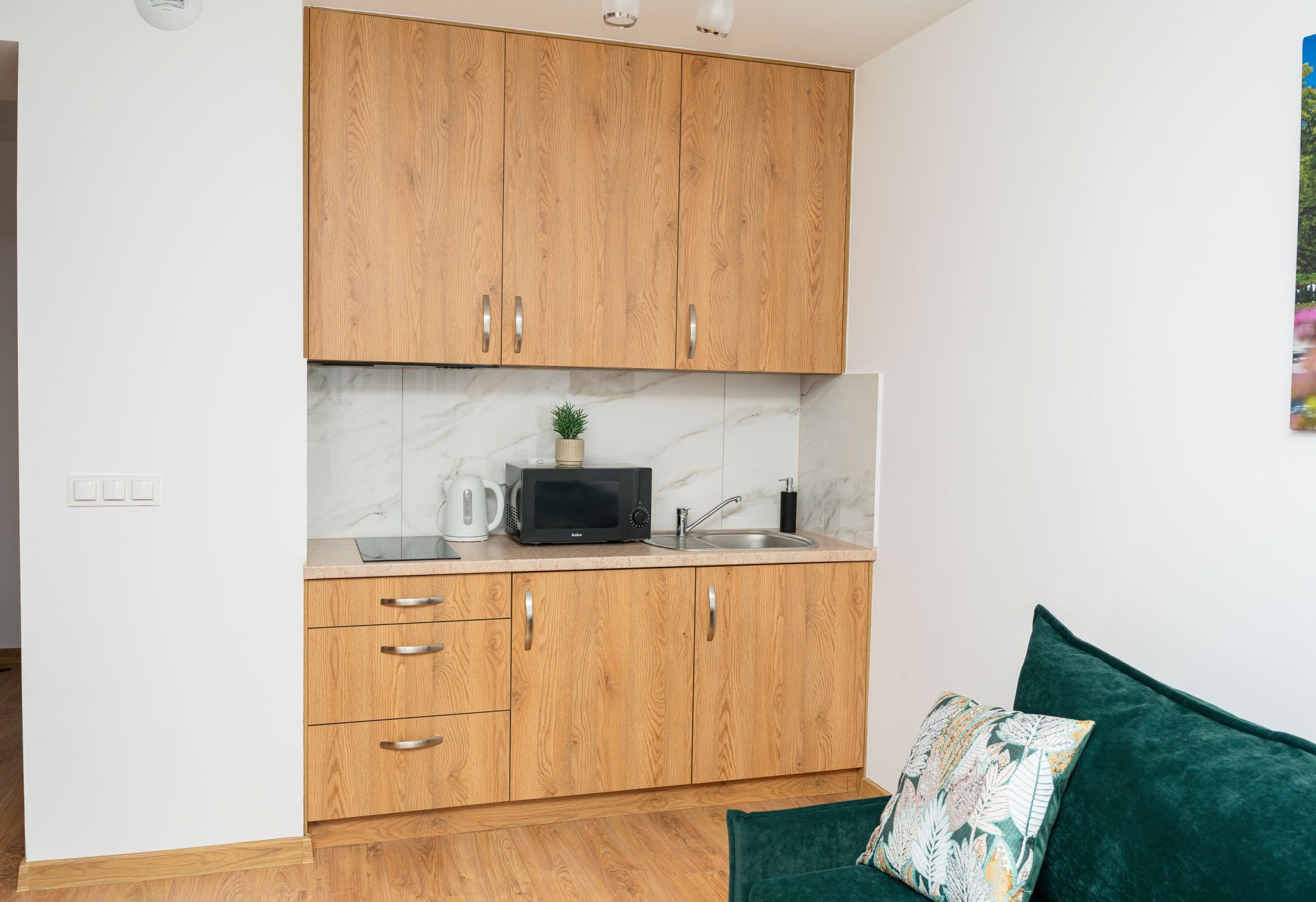 Aneks kuchenny został wyposażony we wszystko, co potrzeba, by samodzielnie przygotować posiłek: płyta indukcyjna, kuchenka mikrofalowa, lodówka, czajnik elektryczny, zastawa stołowa, garnki i przybory kuchenne. W łazience jest kabina prysznicowa, zestaw podstawowych środków higienicznych oraz zestaw ręczników.