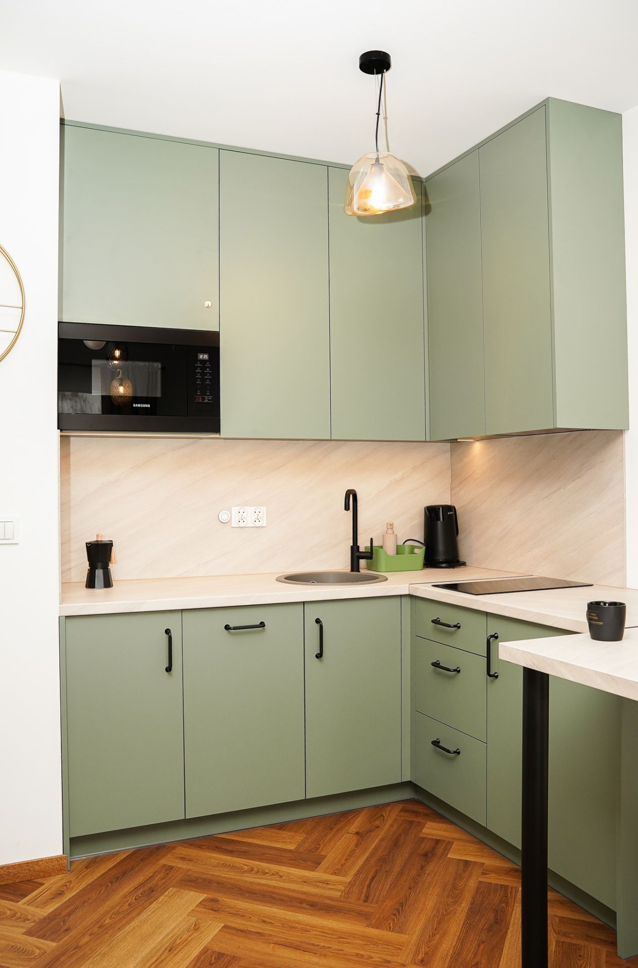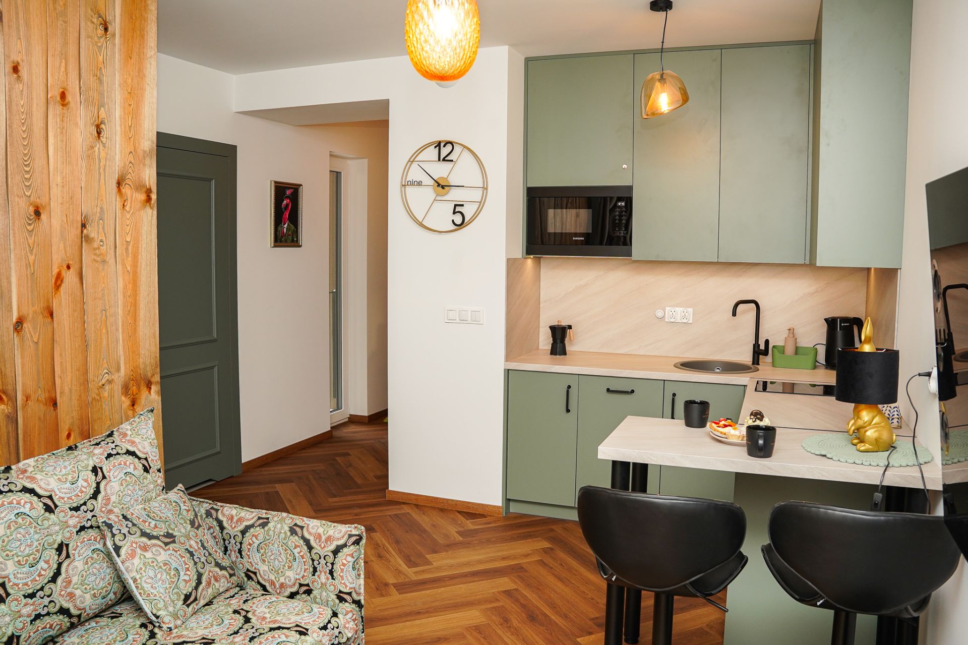 Aneks kuchenny został wyposażony we wszystko, co potrzeba, by samodzielnie przygotować posiłek: płyta indukcyjna, kuchenka mikrofalowa, lodówka, czajnik elektryczny, zastawa stołowa, garnki i przybory kuchenne. W łazience jest kabina prysznicowa, pralka zestaw podstawowych środków higienicznych oraz zestaw ręczników.