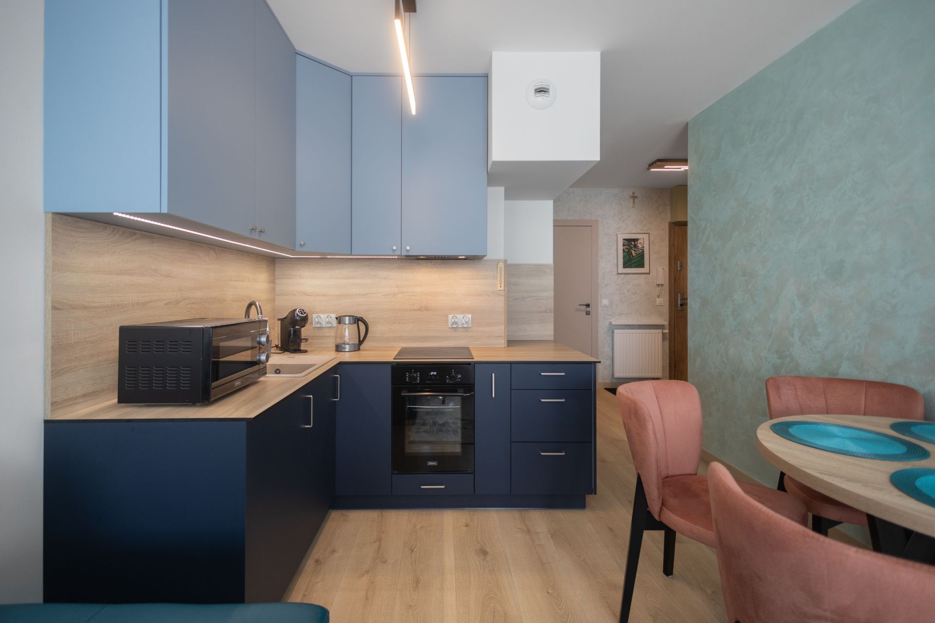 Aneks kuchenny został wyposażony we wszystko, co potrzeba, by samodzielnie przygotować posiłek: ekspres do kawy, płyta indukcyjna, piekarnik, kuchenka mikrofalowa, lodówka, czajnik elektryczny, zastawa stołowa, garnki i przybory kuchenne. W łazience jest bardzo duża kabina prysznicowa, pralka, zestaw podstawowych środków higienicznych oraz zestaw ręczników.