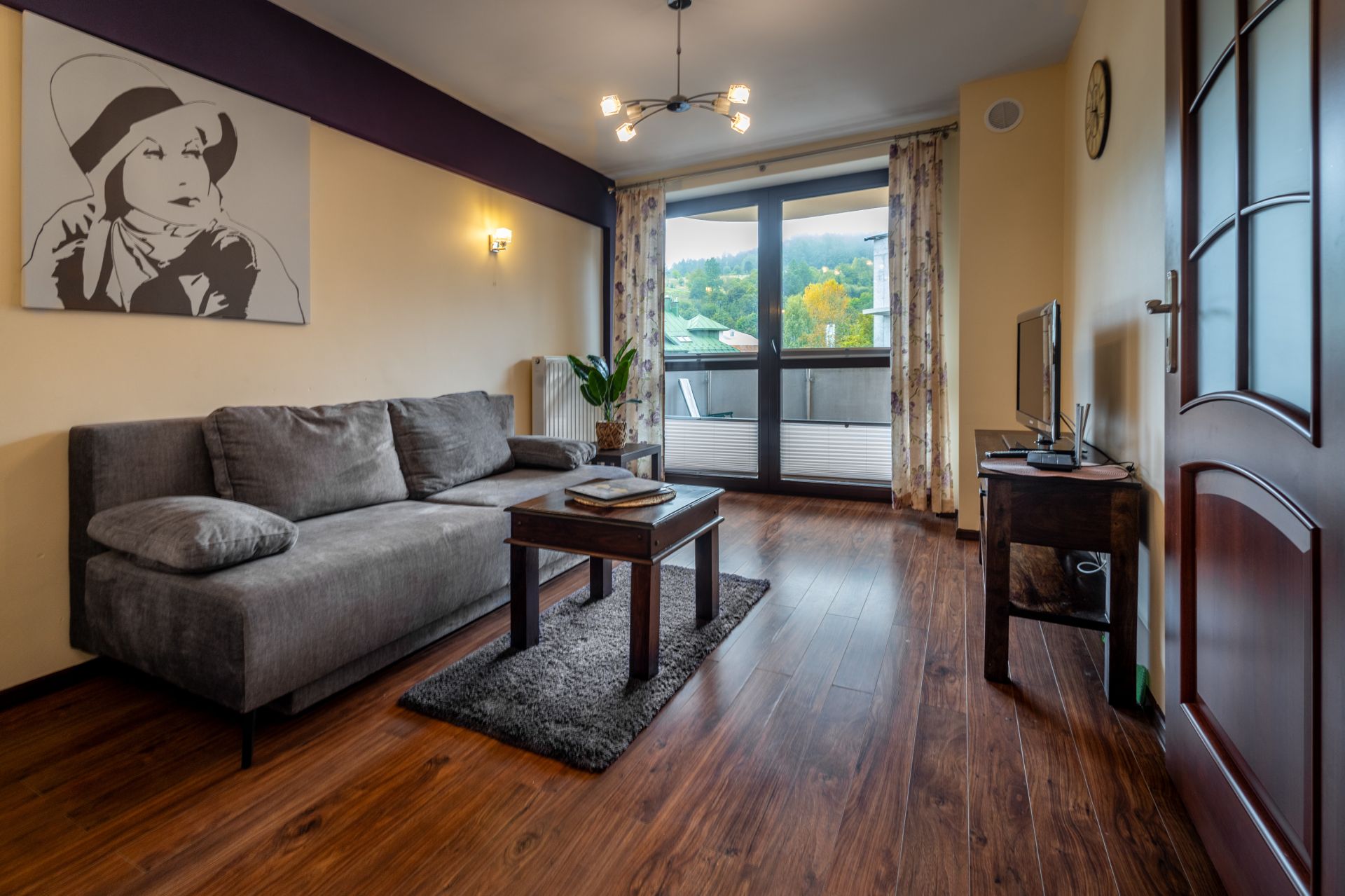 Największym atutem apartamentu jest duży balkon, z którego roztacza się fantastyczny widok na miasto i okoliczne góry.