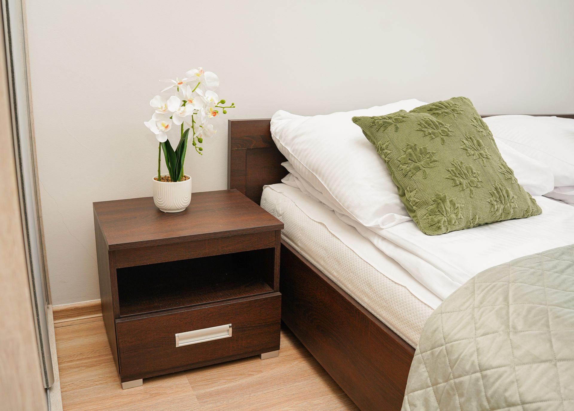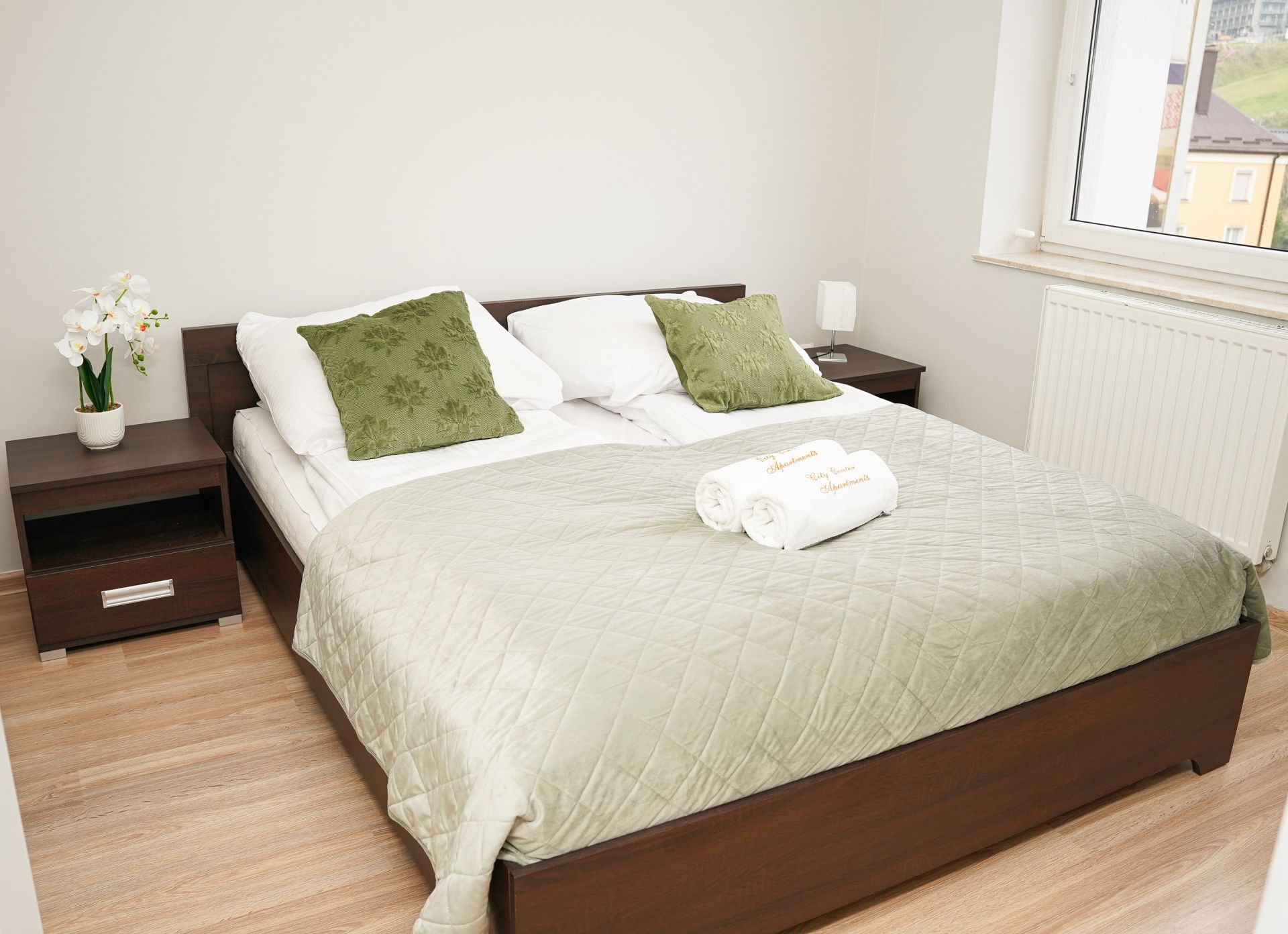 Apartament dla siedmiu osób. Składa się z dwóch sypialni, salonu, kuchni oraz łazienki. Urządzony przytulnie i funkcjonalnie, Wyposażenie obejmuje wszystkie potrzebne Gościom rzeczy, w pełni wyposażona kuchnia pozwala na samodzielne przygotowanie posiłków. Duże okna sprawiają, że apartament jest słoneczny. Idealny dla rodzin.