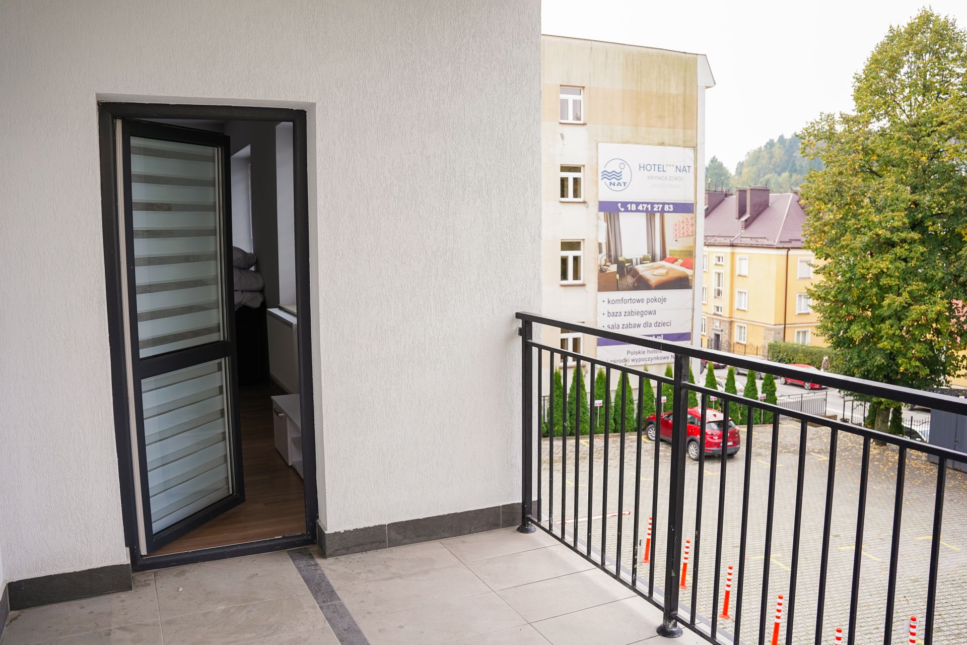 W apartamencie jest duży balkon z pięknym widokiem na miasto i okoliczne góry. .