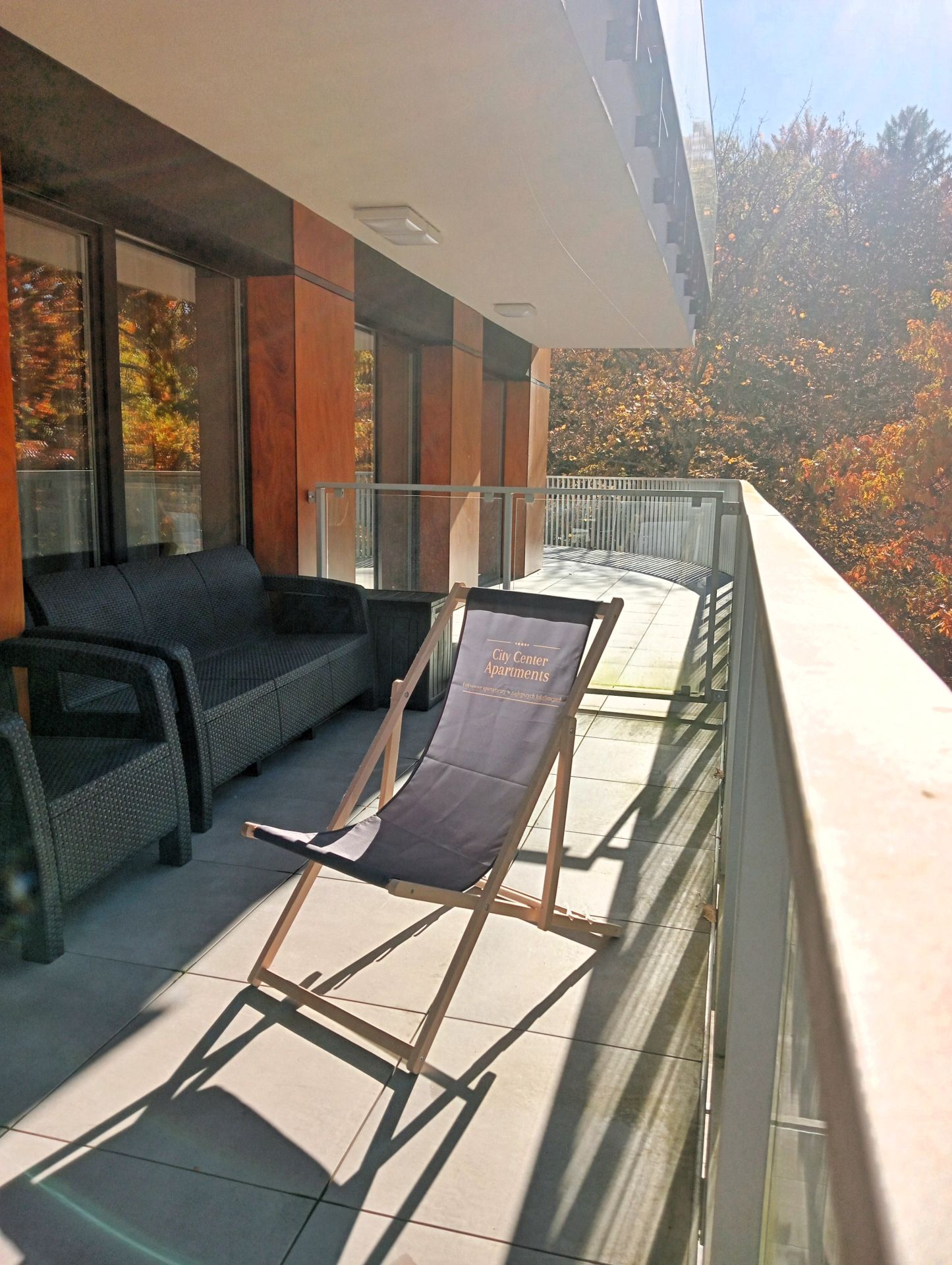 Niewątpliwym atutem apartamentu jest ogromny taras, który stanowi doskonałe miejsce do relaksu na świeżym powietrzu, wyposażony w zestaw wypoczynkowy, z widokiem na miasto i las.