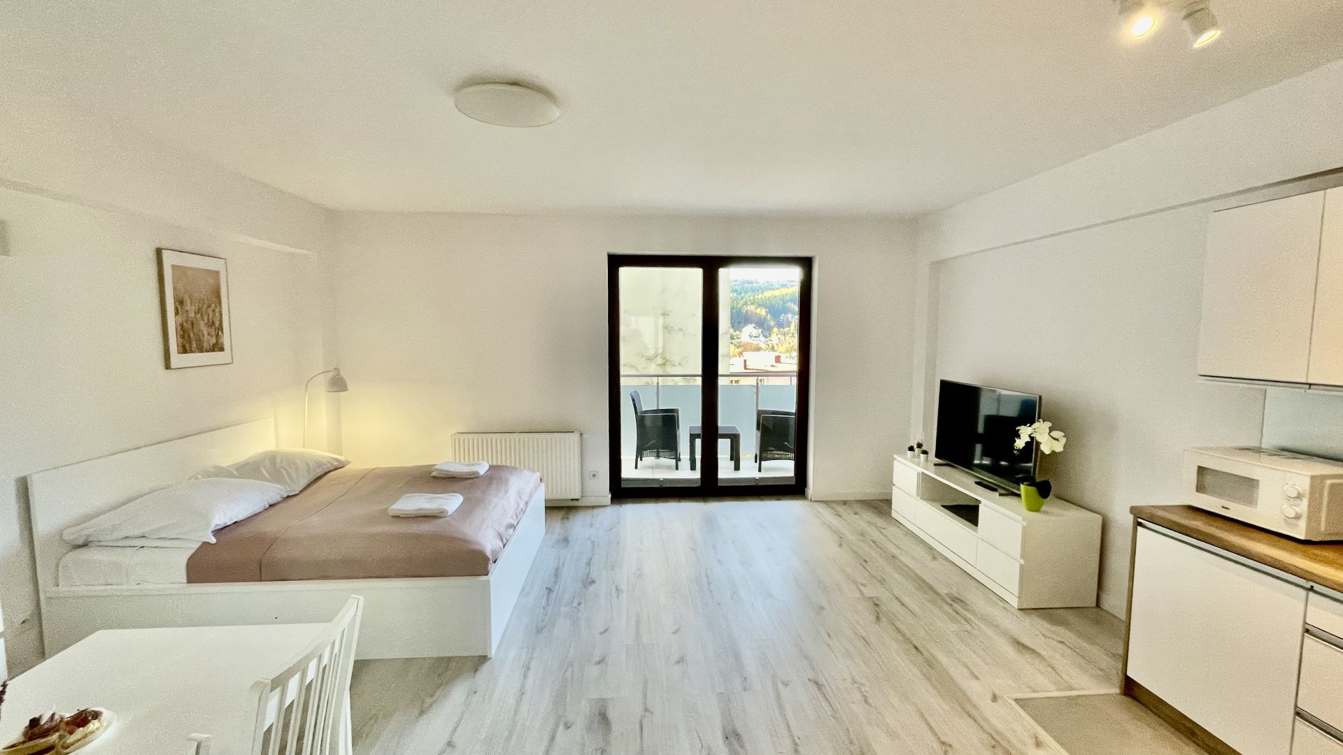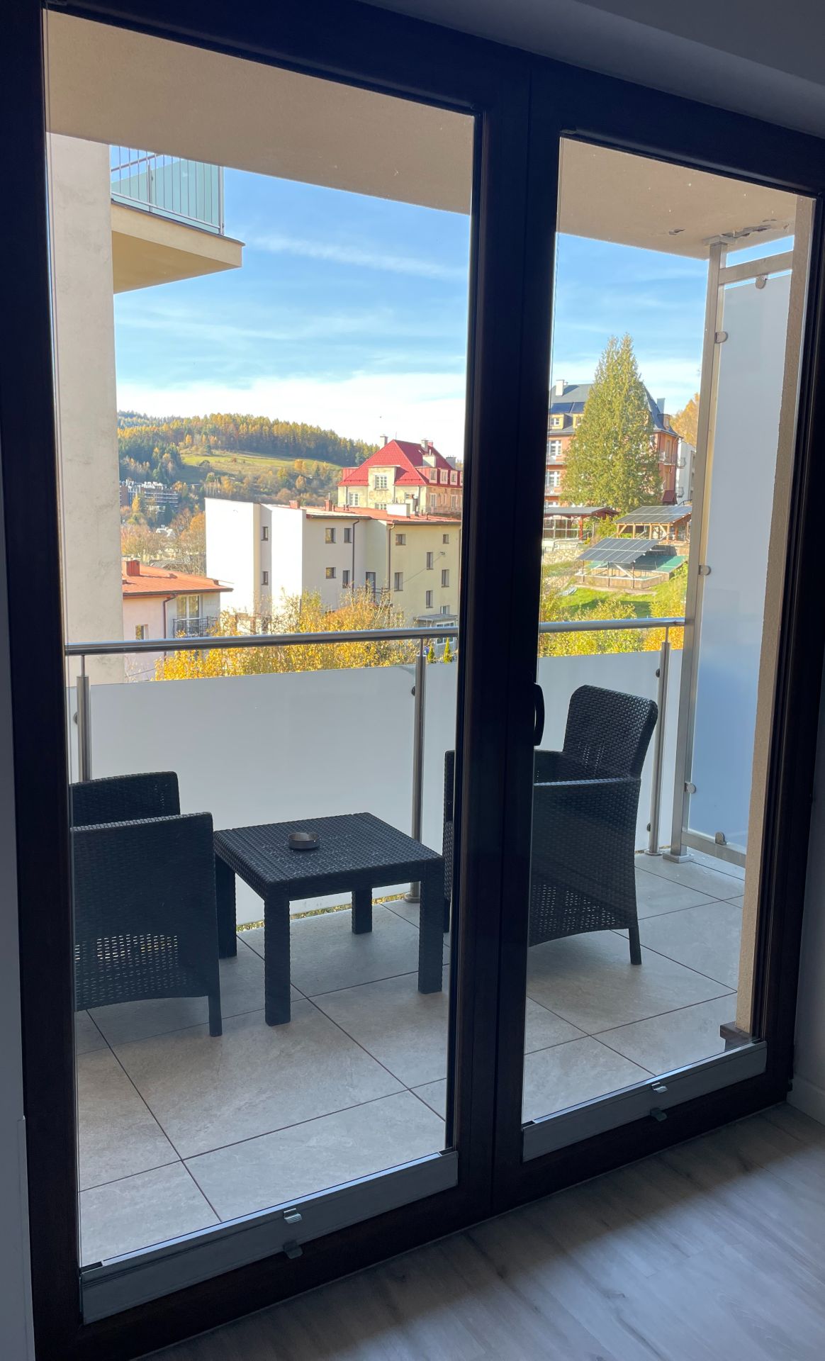W apartamencie jest balkon z widokiem na miasto oraz okoliczne góry.