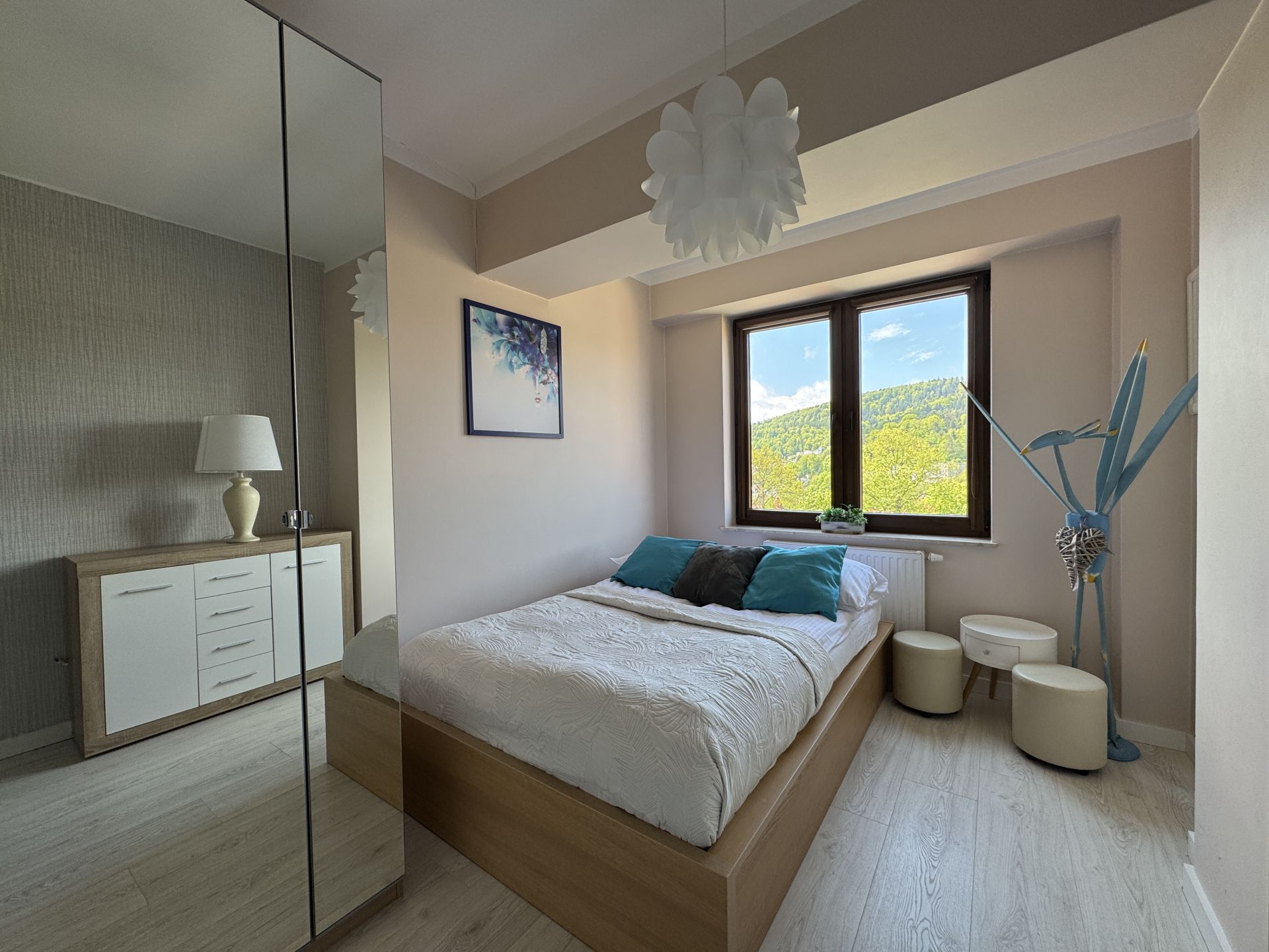W sypialni znajduje się wygodne łóżko i pojemna szafa. W pełni wyposażony aneks kuchenny ( piekarnik, zmywarka, mikrofalówka, lodówka z zamrażarką, ekspres do kawy, przybory kuchenne, zastawa stołowa) pozwala na samodzielne przygotowanie posiłków, W łazience jest duża kabina prysznicowa i pralka. Niebanalne dodatki tworzą unikalny klimat apartamentu.