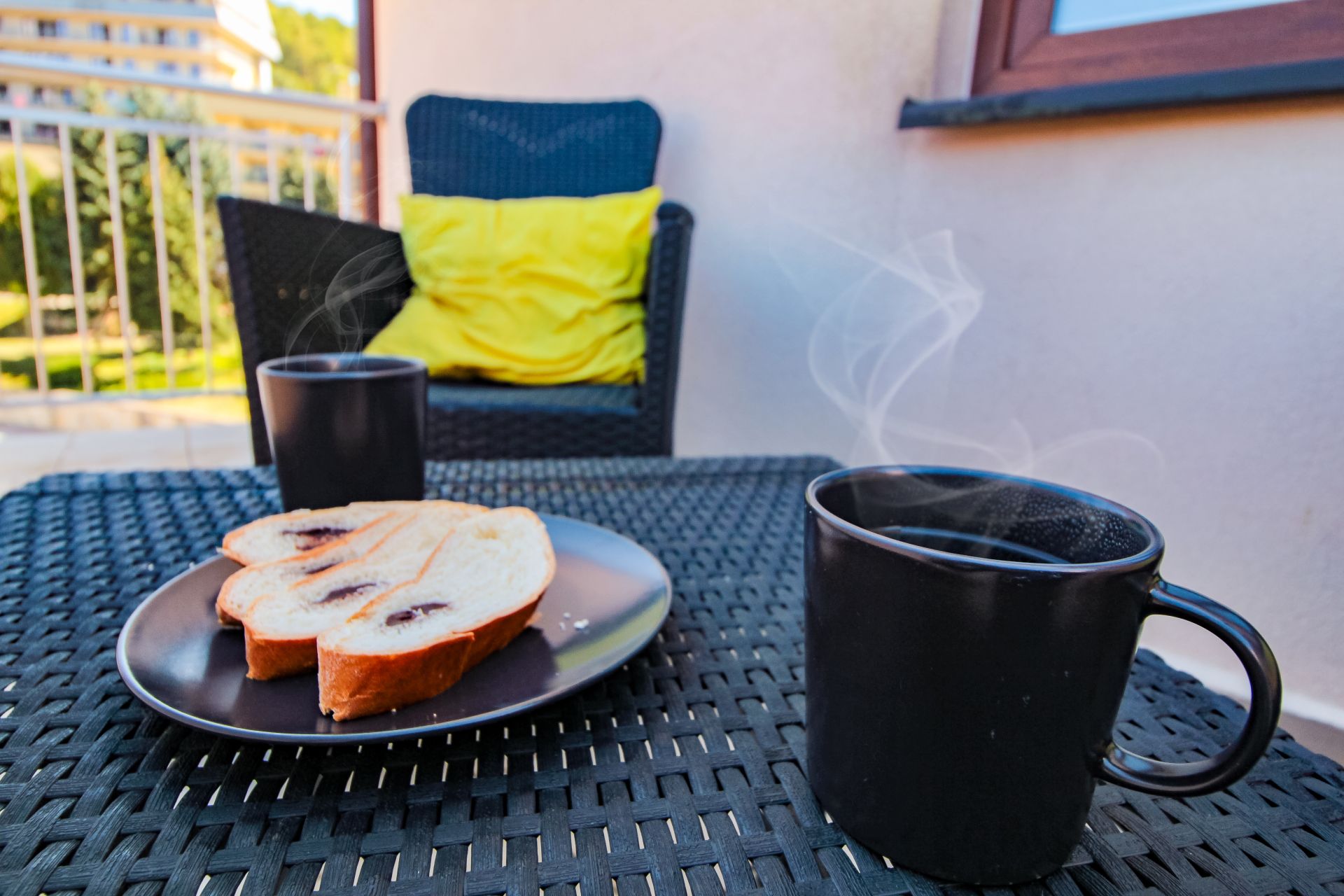 W apartamencie jest balkon z widokiem na miasto oraz okoliczne góry.