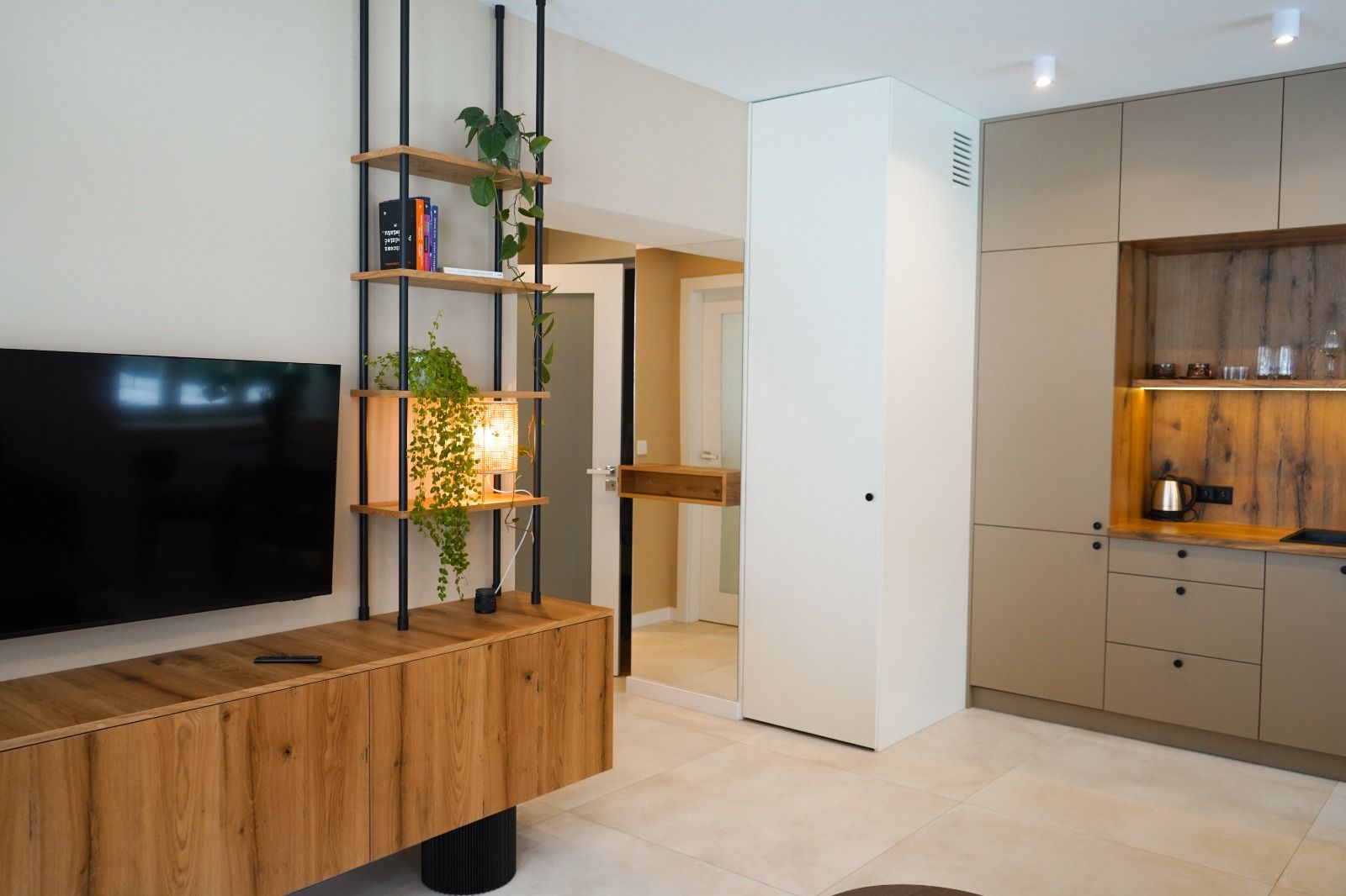 W sypialni jest wygodne łóżko, natomiast w salonie do spania służy niekonwencjonalna sofa. Duża przestrzeń do przechowywania rzeczy sprawia, że apartament idealnie nadaje się na dłuższe pobyty.
