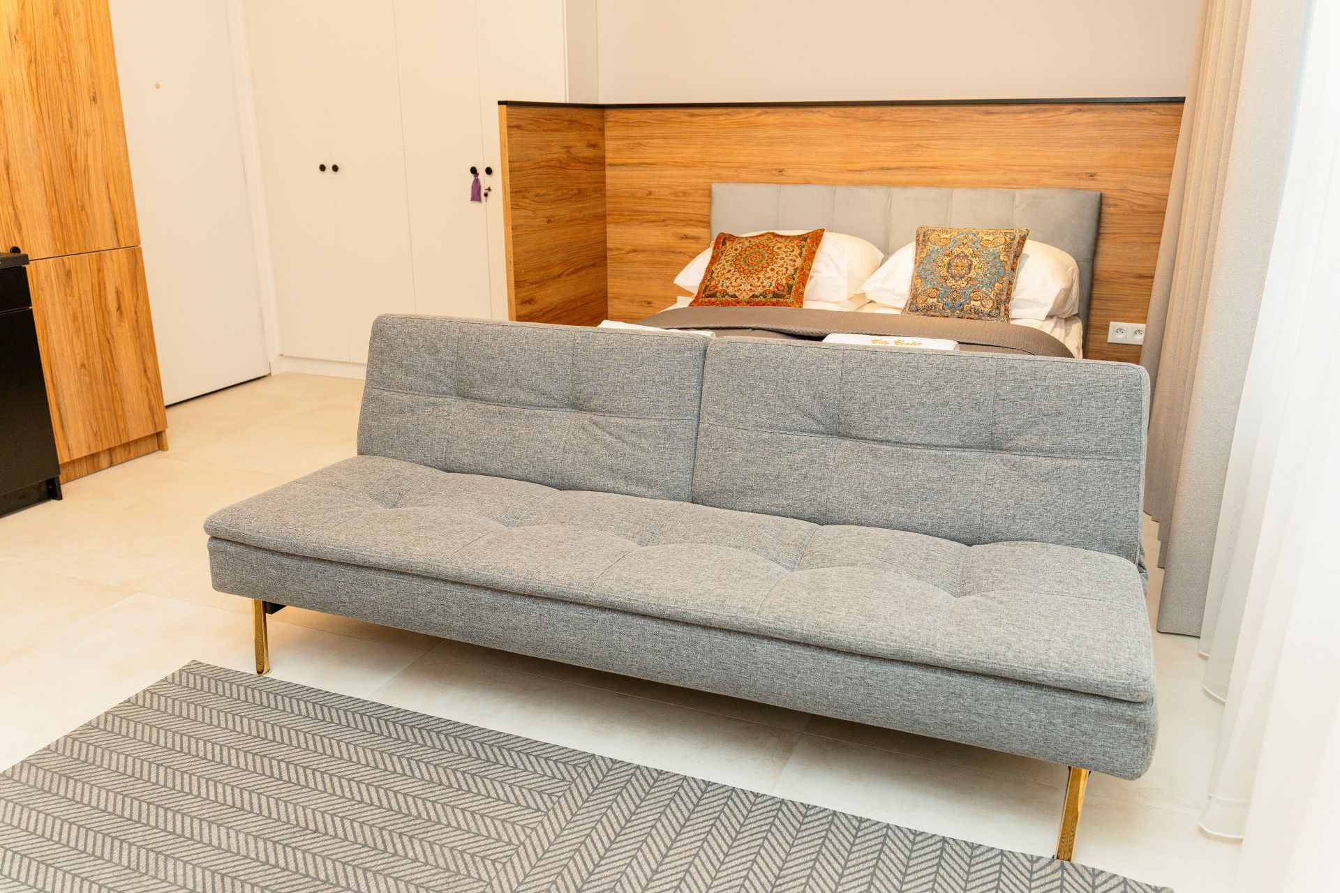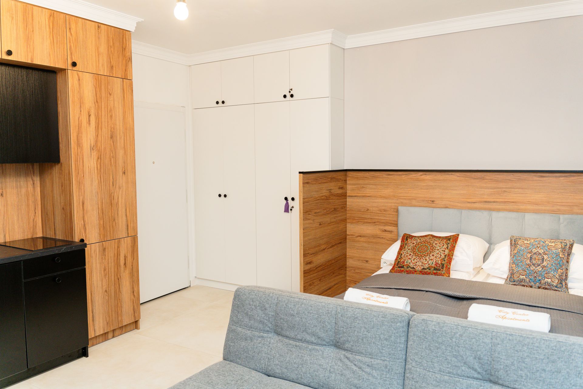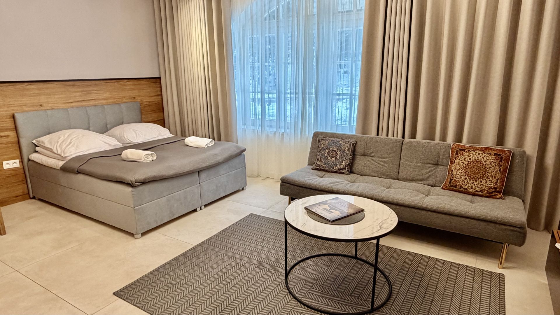 W apartamencie znajduje się duże łóżko oraz sofa, która dzieli przestrzeń na część dzienną i sypialnianą. W pełni wyposażony aneks kuchenny pozwoli na samodzielne przygotowane prostych posiłków, a w łazience jest duża kabina prysznicowa.