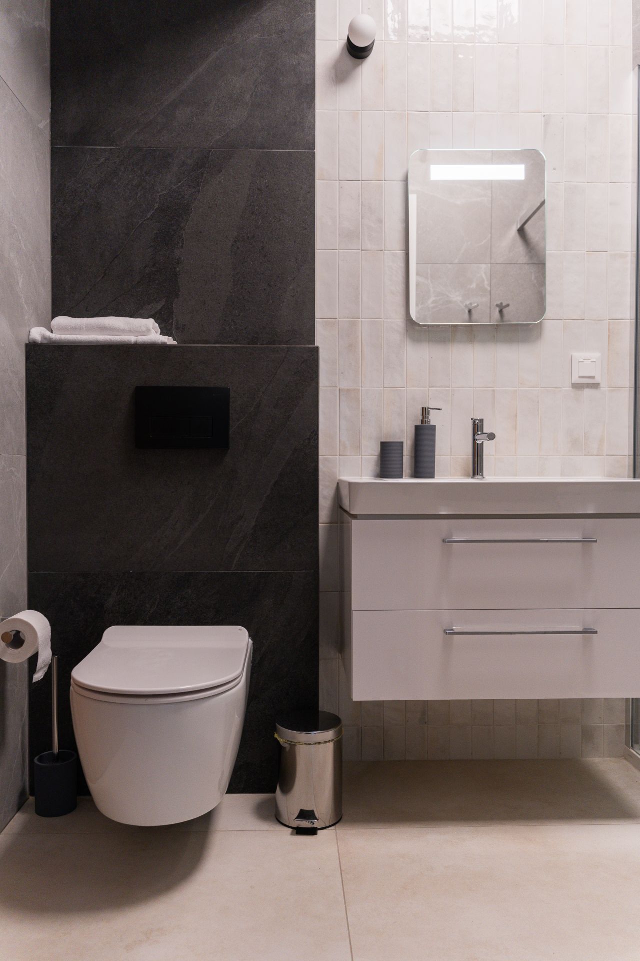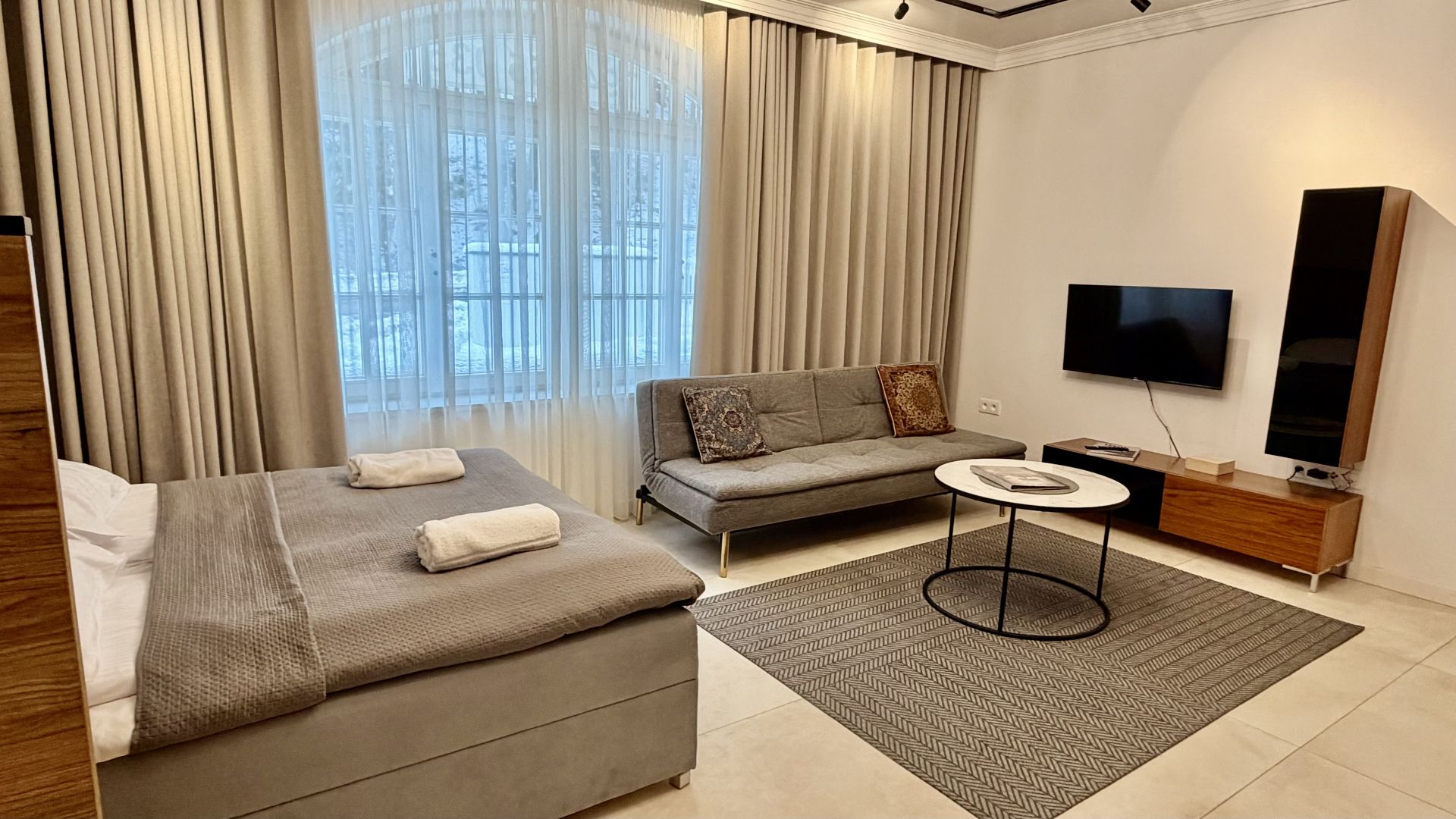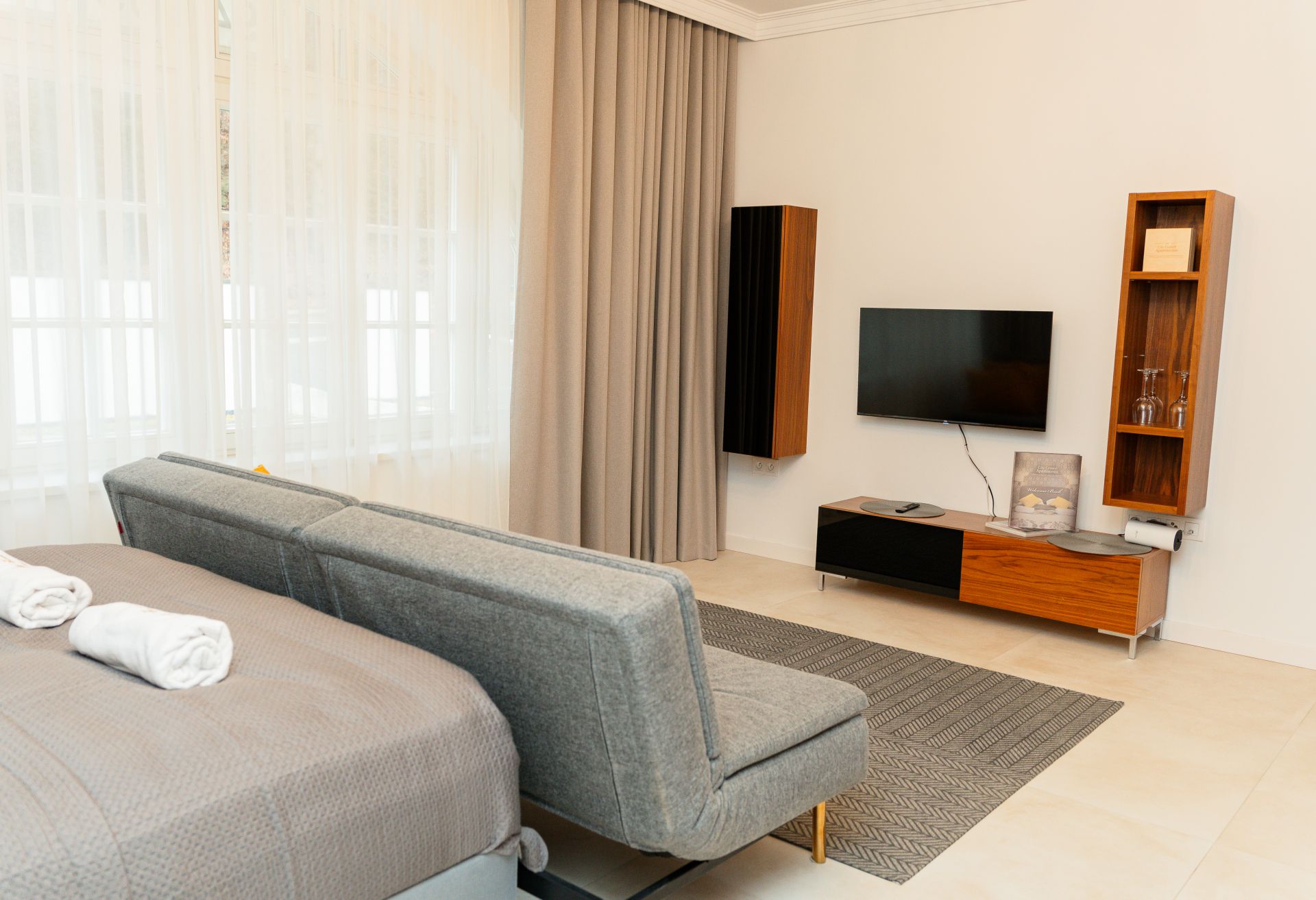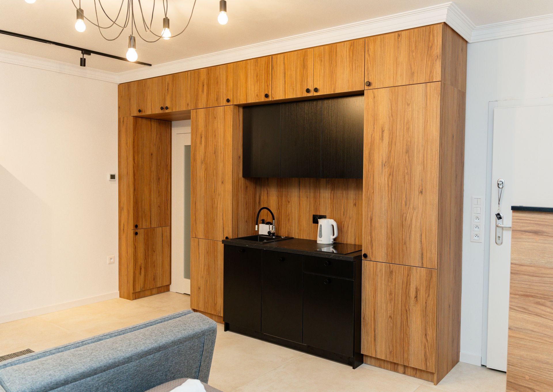 W apartamencie znajduje się duże łóżko oraz sofa, która dzieli przestrzeń na część dzienną i sypialnianą. W pełni wyposażony aneks kuchenny pozwoli na samodzielne przygotowane prostych posiłków, a w łazience jest duża kabina prysznicowa.