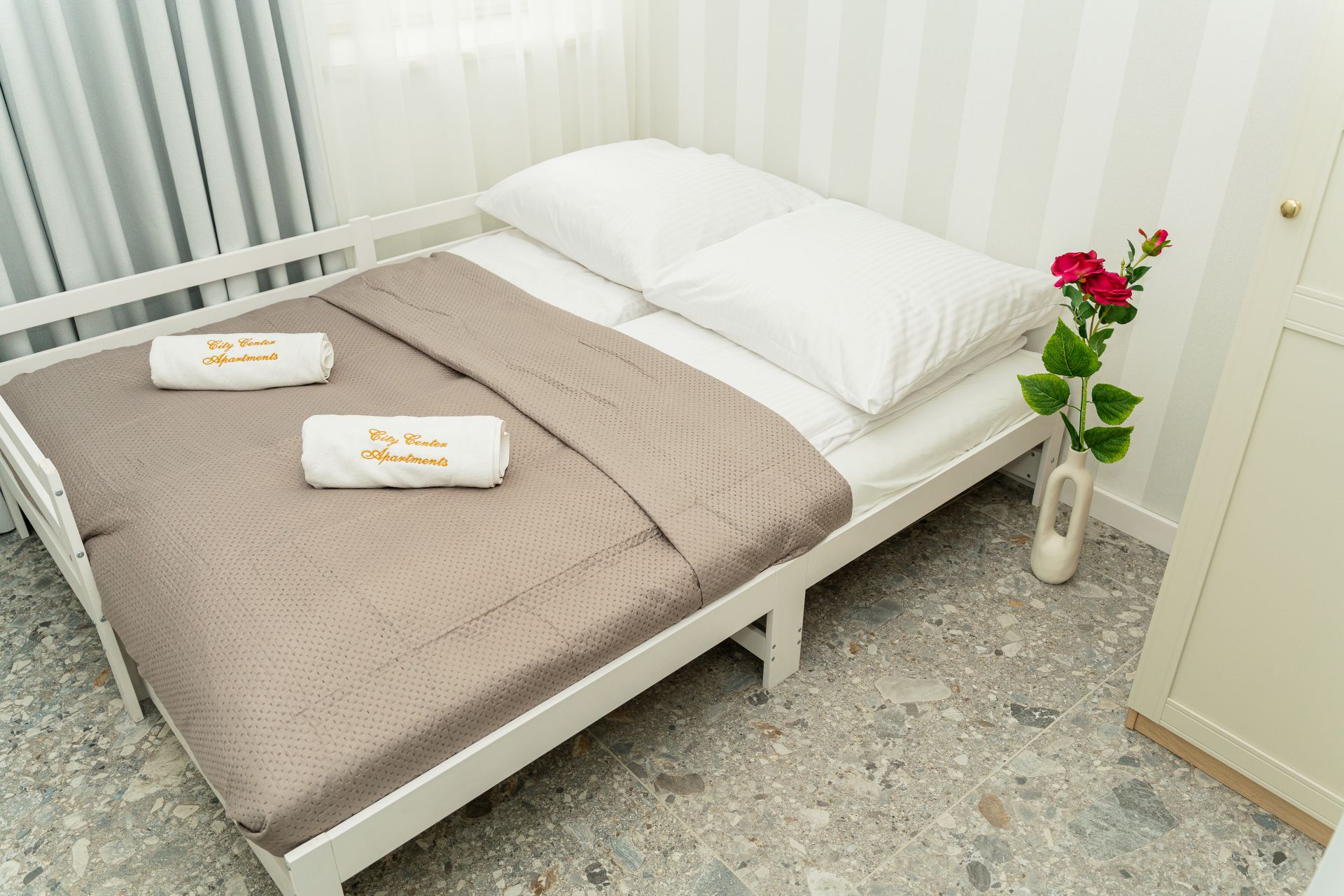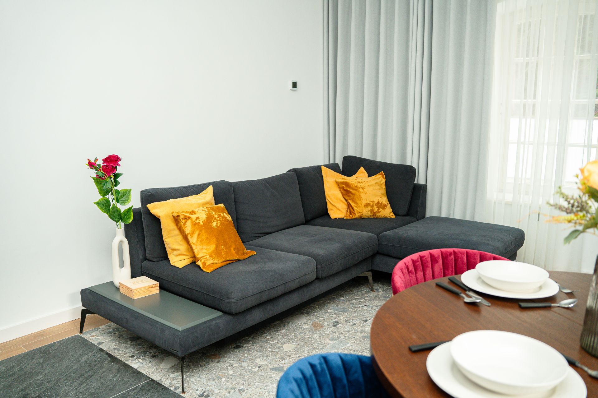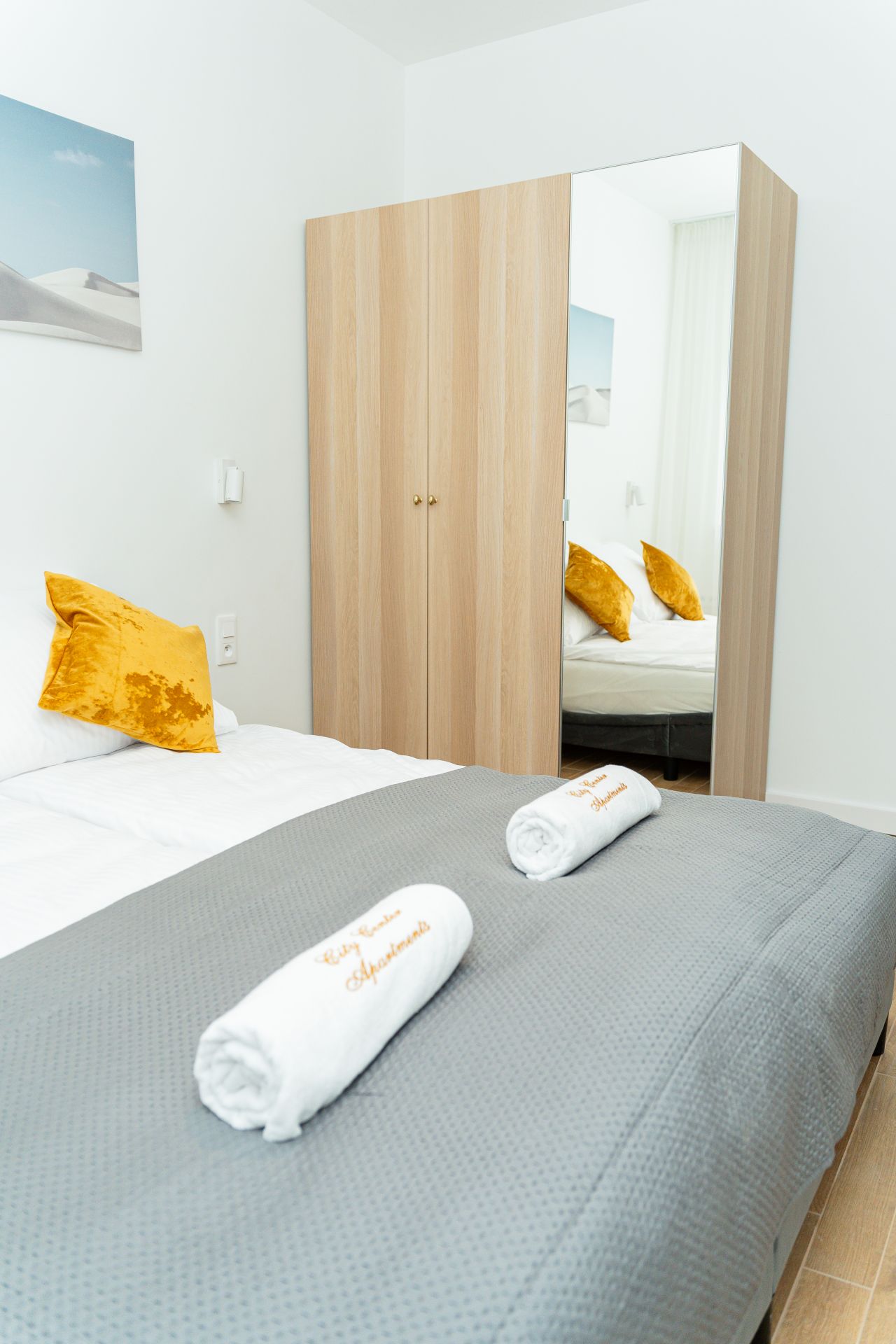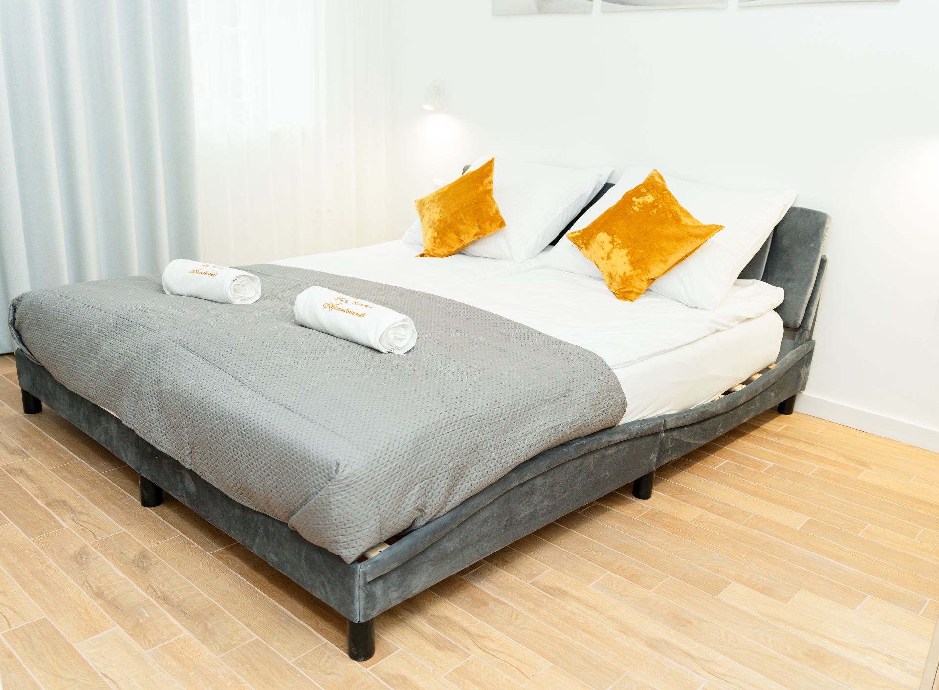 W apartamencie znajdują się dwie sypialnie, każda z dużym łóżkiem oraz salon z aneksem kuchennym.